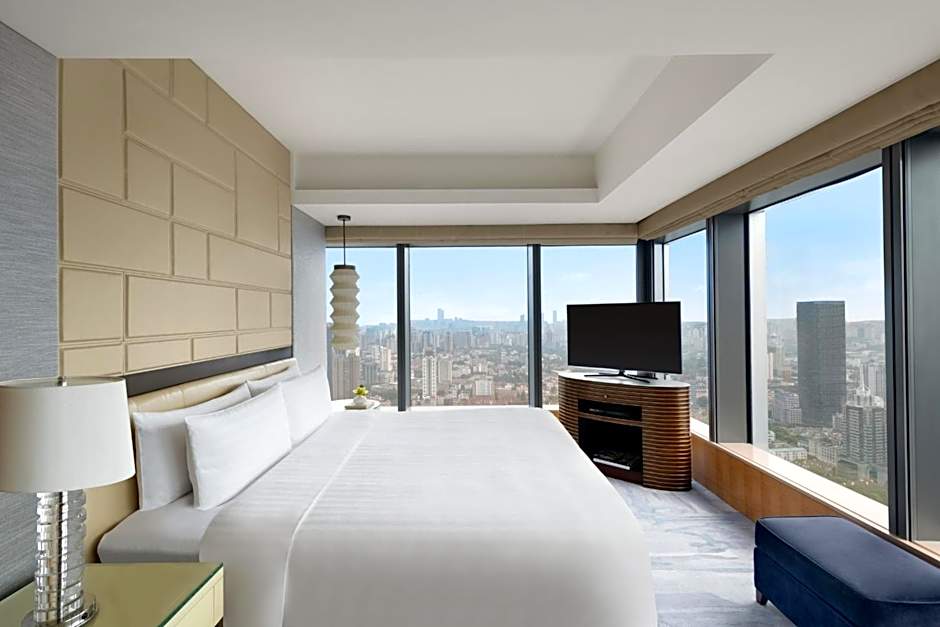 Deluxe Room features floor to ceiling windows offering clear views of Shanghai, marble bathroom with floor heating for optimal comfort, separate bathroom and toilet, and branded toiletries.